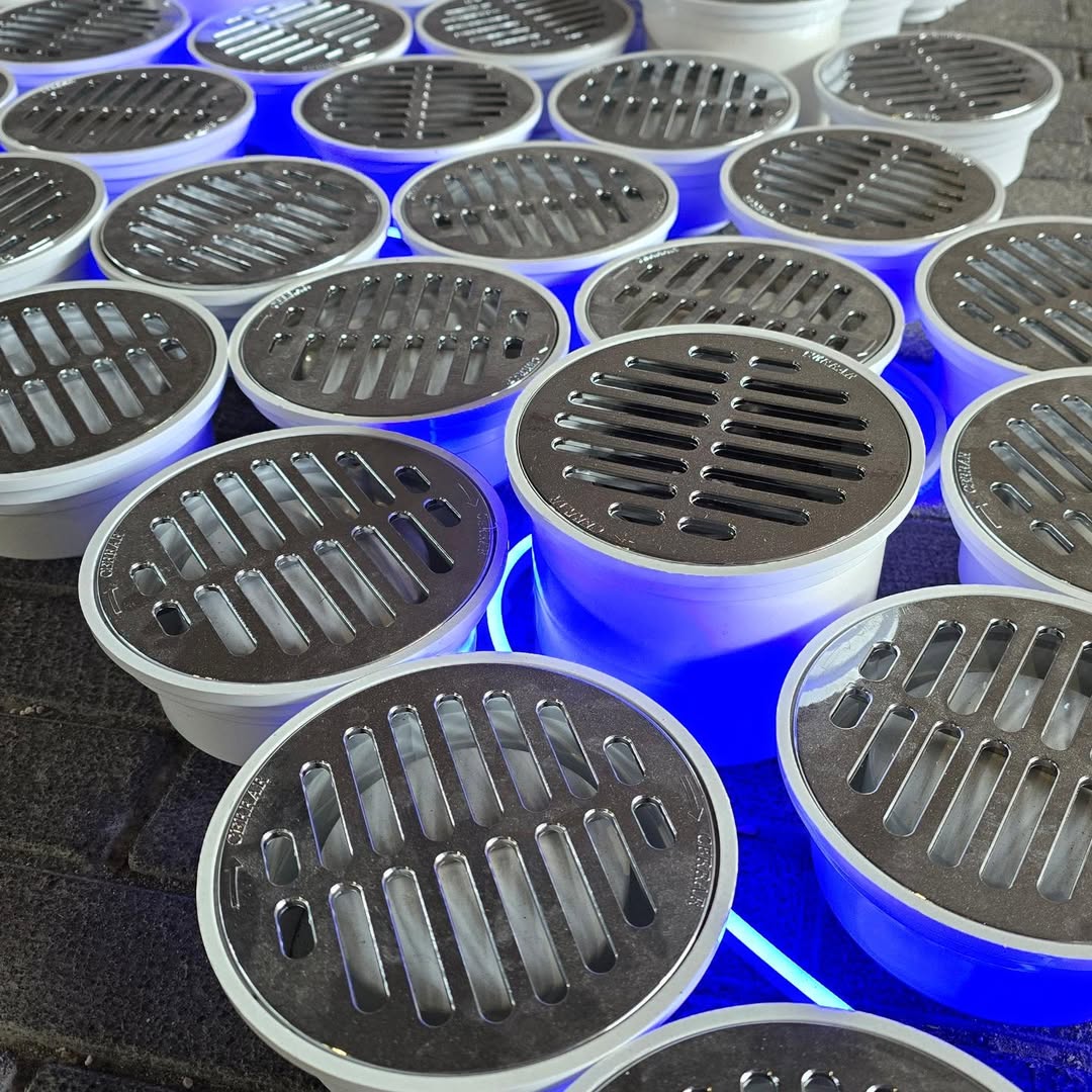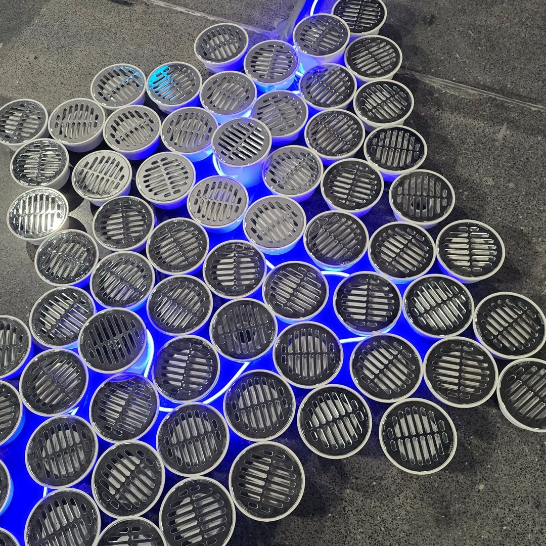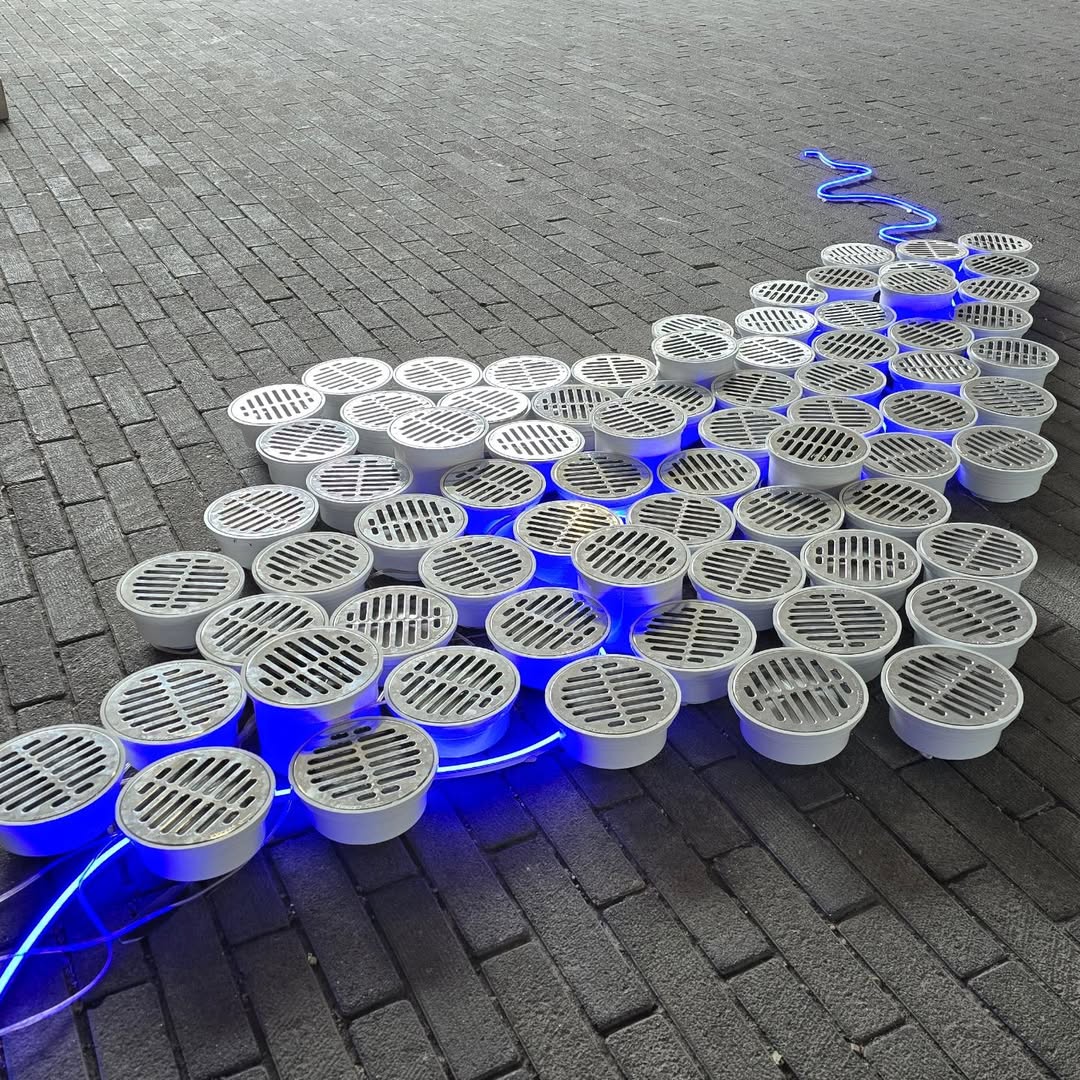 “La instalación se compone de un conjunto de coladeras cuya forma asemeja la figura del Estado de Nuevo León y es atravesada por una luz. Algunas coladeras, tienen en su interior bocinas que emiten sonidos de ríos de Nuevo León. Esta pieza forma parte del proyecto Artilugios del agua es la consecuencia formal o traducción plástica de una serie de investigaciones que he realizado en sus últimos años sobre el agua en México. En estos proyectos he documentado testimonios, conocimientos y experiencias de las relaciones que las comunidades han desarrollado a lo largo del tiempo con el agua, a partir de un acercamiento y encuentro entre diversos saberes, estéticas y materialidades, insertados en un contexto actual tenso y problemático con respecto al uso y usufructo del agua como recurso, en las grandes ciudades y que en los últimos años ha sufrido una intensa sequía según ha reportado la Comisión Nacional de Agua de México.”