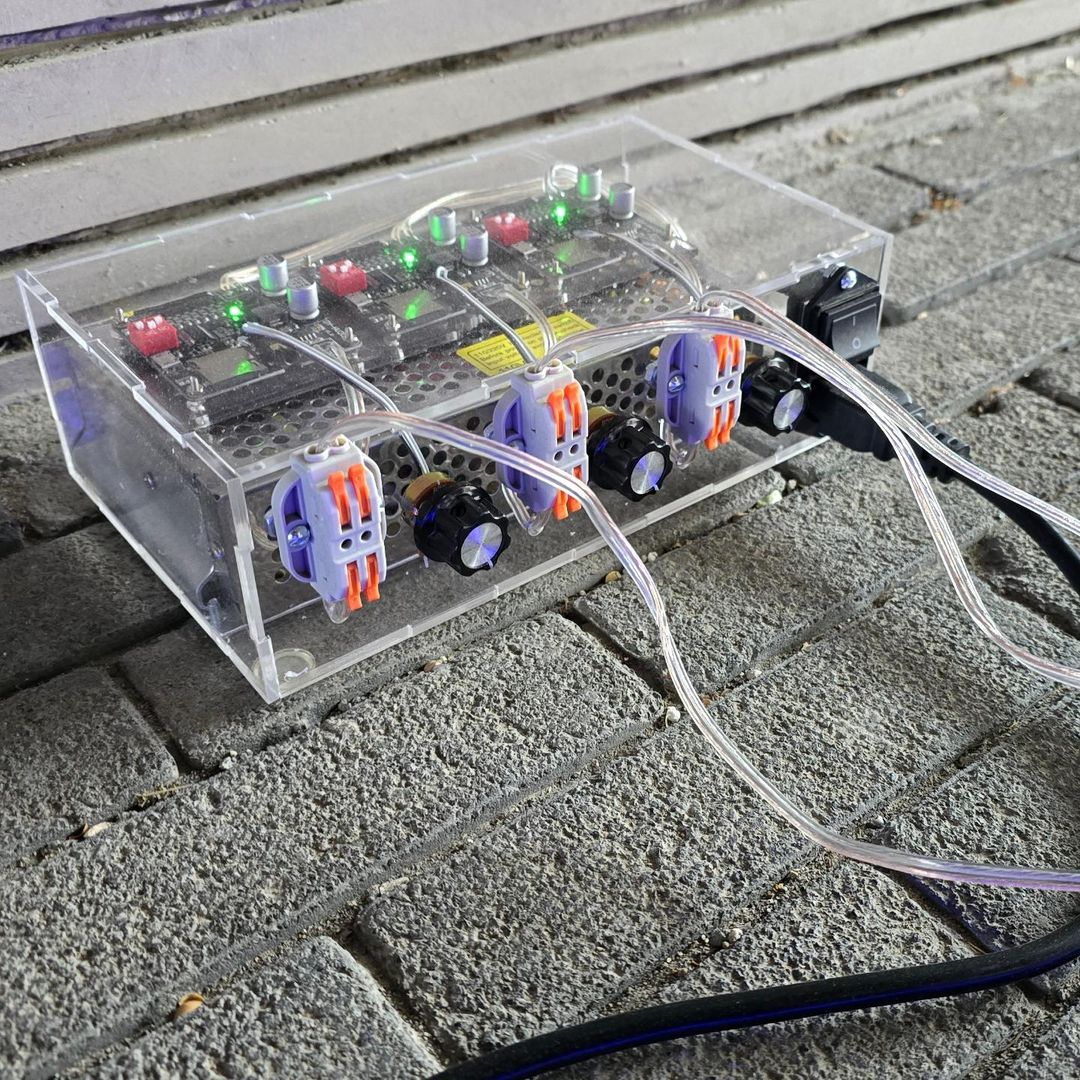Para esta instalación, fabricamos un amplificador de audio multicanal personalizado, para satisfacer las necesidades especificas del artista.