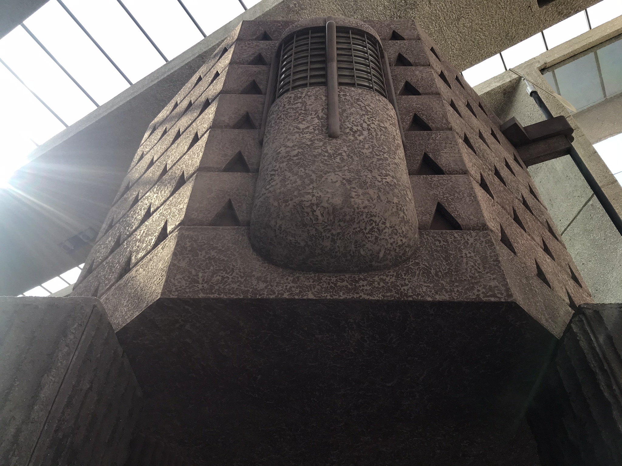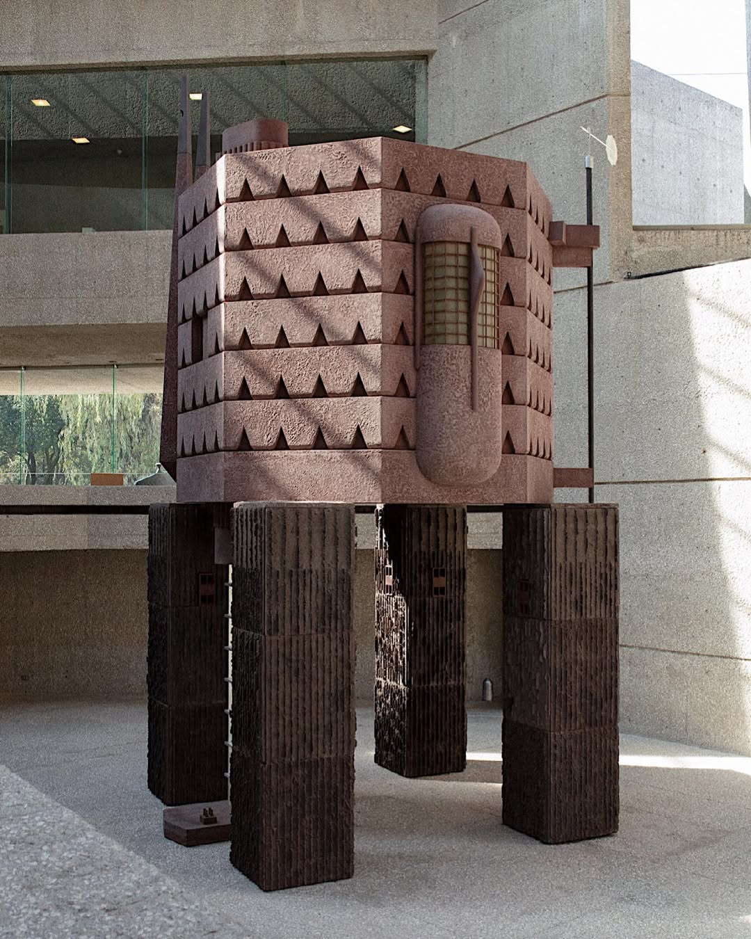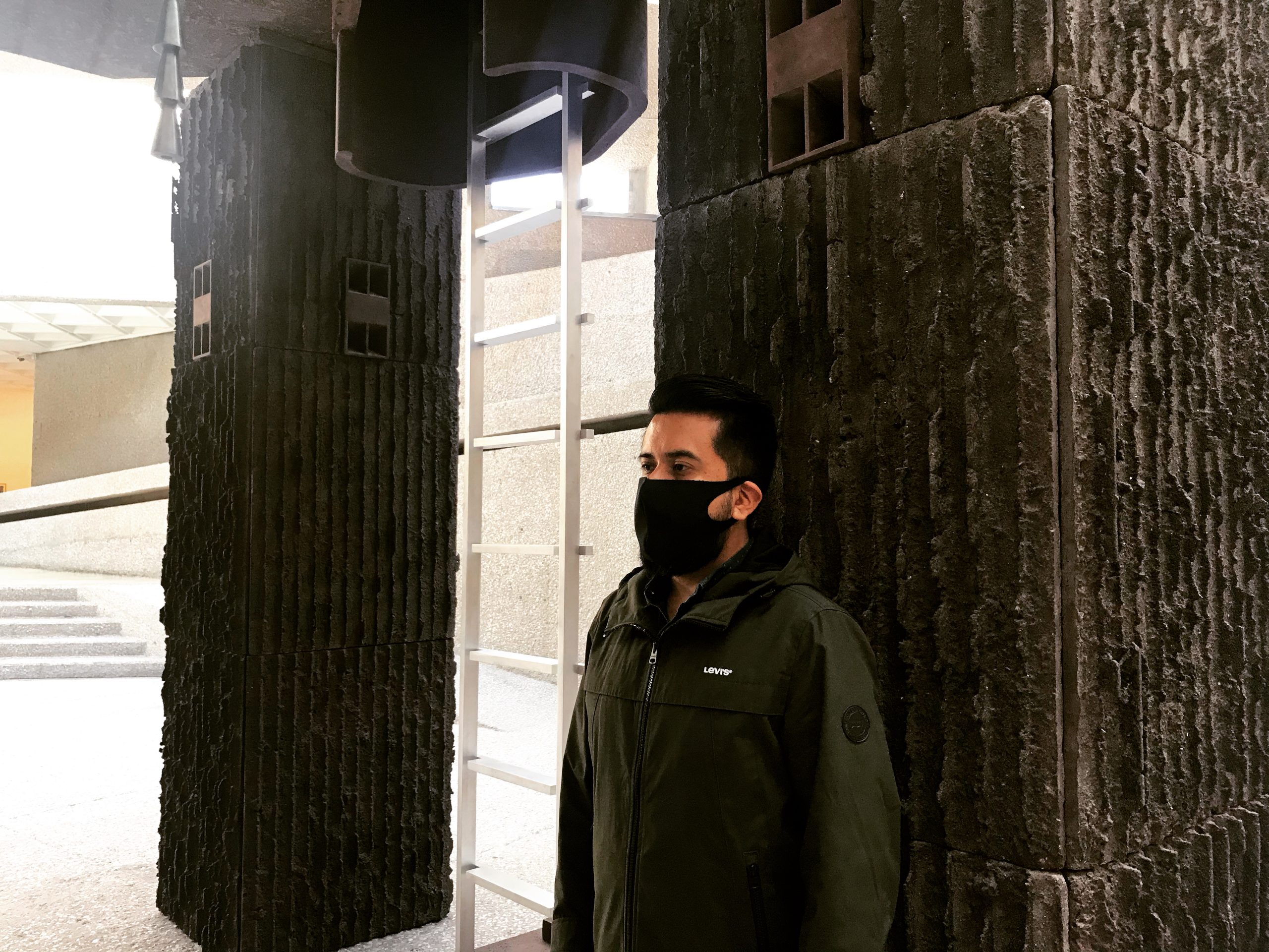 “En respuesta a la invitación del museo, Tezontle transformó su atrio central en una instalación titulada “Ubicación no revelada: máquina para el ermitaño intermitente”, un territorio en el que un espacio habitable y otros objetos domésticos se convierten en un monumento a un pasado lejano o una ruina futurista.