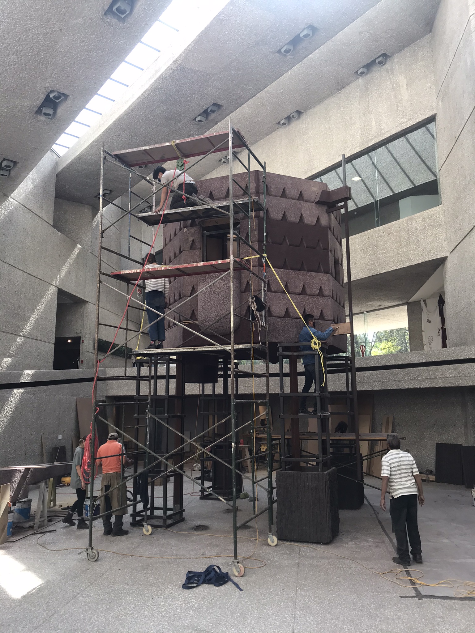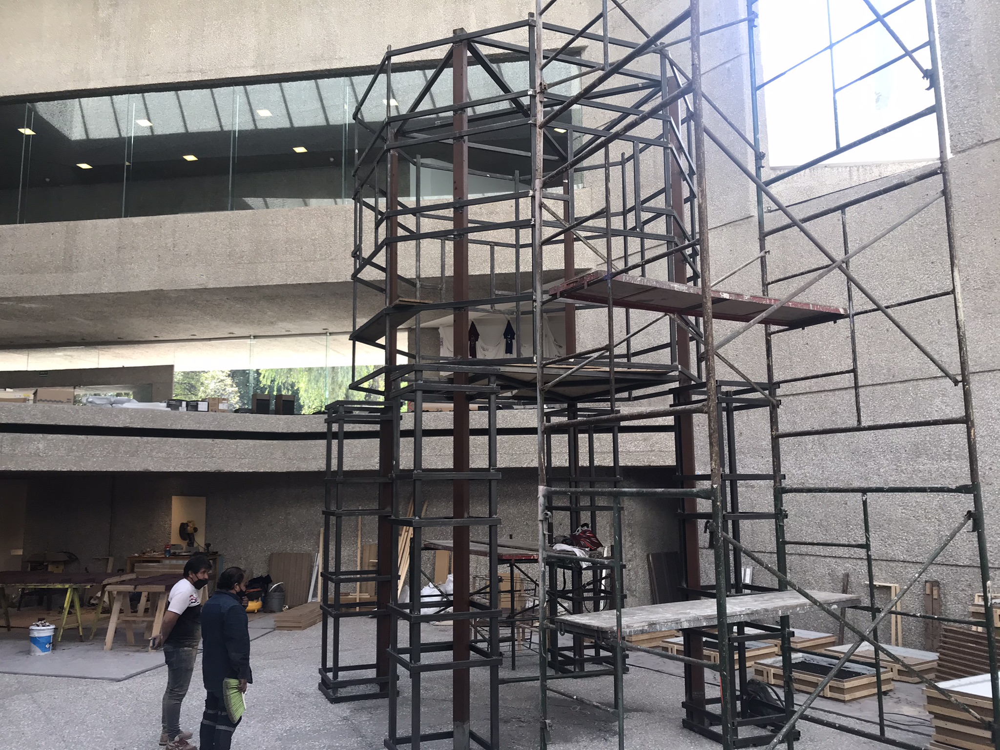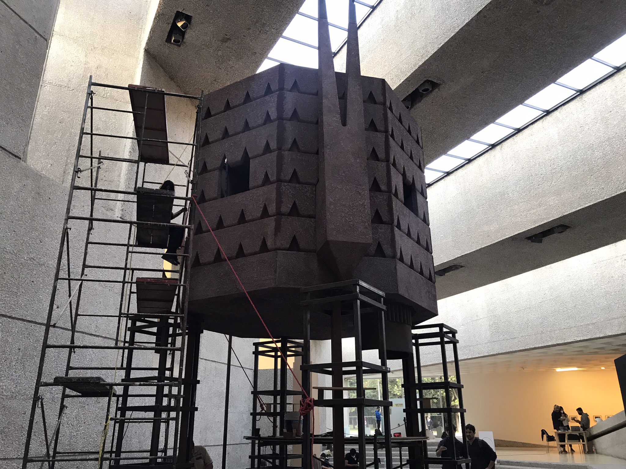 Inspirada en las ruinas de las ermitas coloniales en las áreas circundantes de la Ciudad de México. Un espacio habitable de siete metros de altura, herramientas y artefactos domésticos sugieren la existencia de un arquetipo atemporal. El ermitaño intermitente se convierte en una presencia invisible pero real, que encarna las reflexiones y preocupaciones de los artistas e invita al espectador a meditar sobre la posibilidad de una forma alternativa de vivir, alejada de la ciudad y sus ansiedades.”